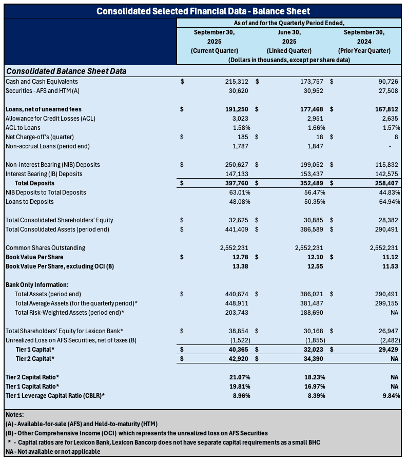 Lexicon Bancorp (“Bancorp”), the parent company for Lexicon Bank (“Bank”) (collectively, “the Company” or “Lexicon”), announces unaudited consolidated financial results as of and for the three and nine months ended September 30, 2025, and 2024. Lexicon continues to focus on personalized concierge banking services for its clients, as reflected in the year-over-year increase in net income, driven by continued growth in loans and deposits.